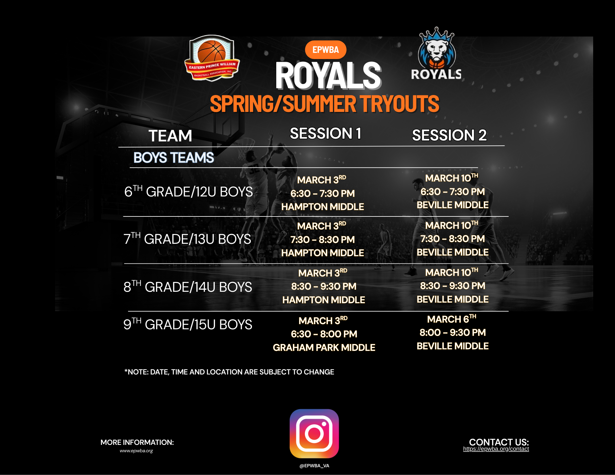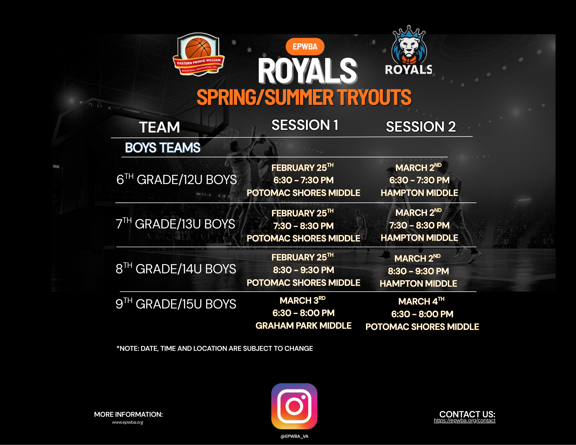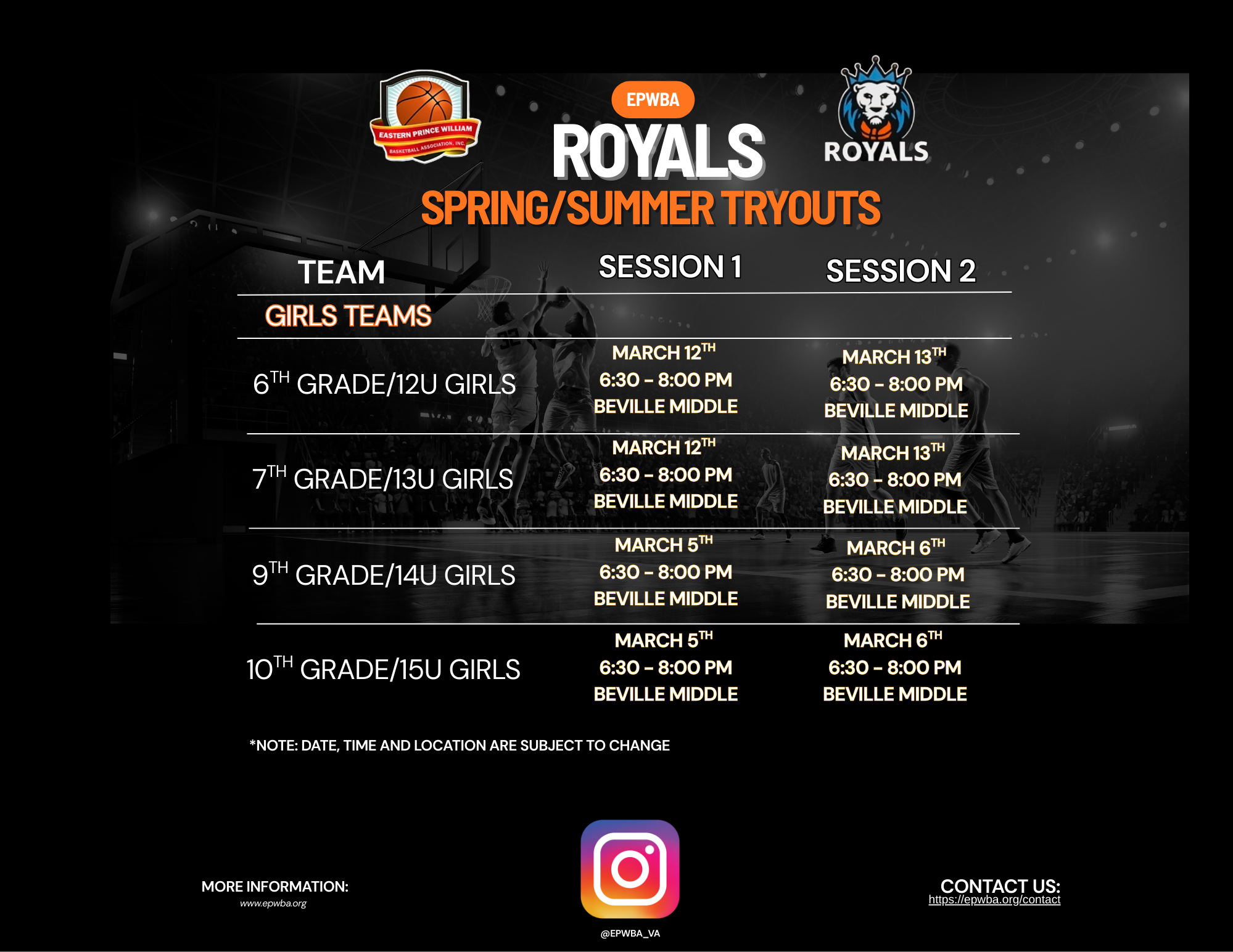 Players chosen for the Winter Travel Season will represent EPWBA Royals in the Fairfax County Youth Basketball League (FCYBL). EPWBA Royals is proud to be the only program exclusively representing the Eastern side of Prince William County in FCYBL competition.